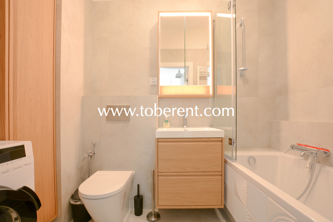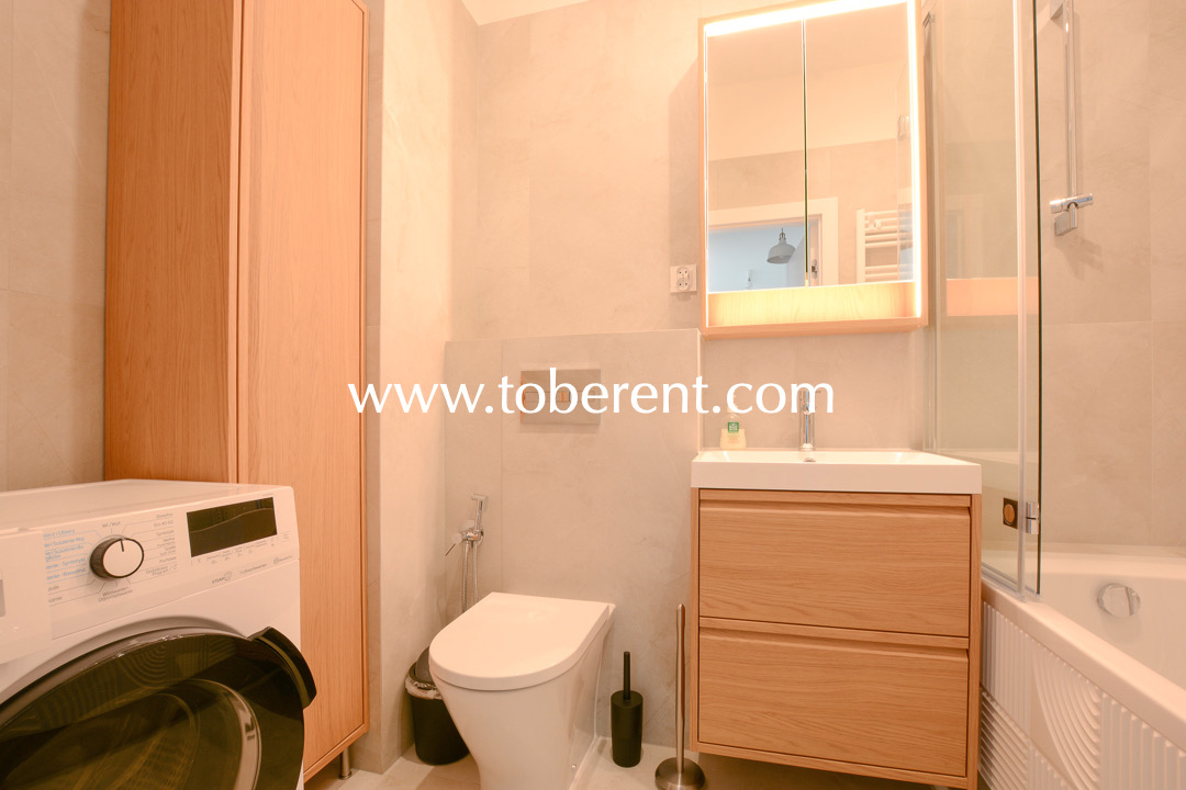 - Łazienka z wanną i szklanym parawanem prysznicowym, pralko-suszarką oraz WC z funkcją bidetu.
